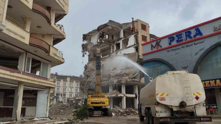 İlçede depremlerde yıkılan ya da ağır hasarlı olduğu için yıkım kararı alınan binalarda enkaz kaldırma çalışmaları ekiplerce gerçekleştiriliyor. Yıkım işleminin yapılacağı alanlarda herhangi bir olumsuzluk yaşanmaması için güvenlik önlemi alan ekipler, yıkımın ardından çıkan molozları kamyonlarla enkaz döküm alanlarına götürüyor.