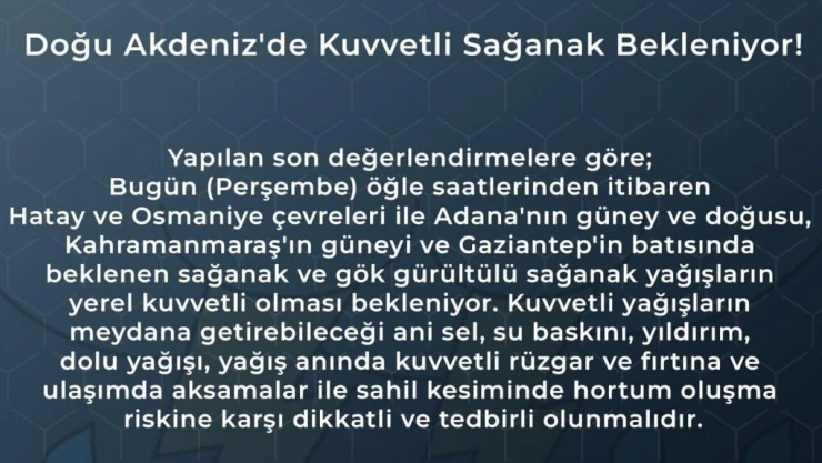 Hatay Meteoroloji Müdürlüğü’nün tarafından yapılan uyarıda, “Bugün (Perşembe) günü Hatay ve ilçelerinde beklenen sağanak ve gök gürültülü sağanak yağışların yerel kuvvetli olması bekleniyor. Kuvvetli yağışların meydana yol açabileceği ani sel, su baskını, yıldırım, dolu yağışı, yağış anında kuvvetli rüzgar ve fırtına ve ulaşımda aksamalar ile sahil kesiminde hortum oluşma riskine karşı dikkatli ve tedbirli olunmalıdır” ifadelerini kullandı.