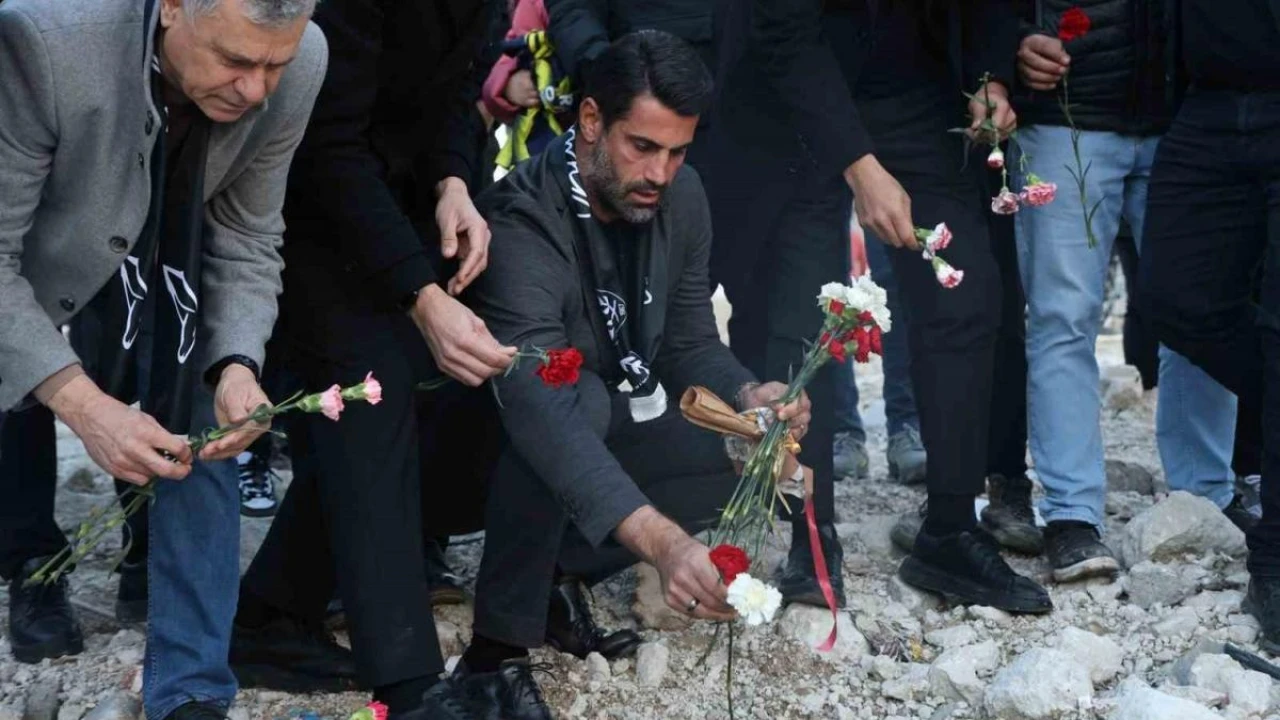 Hatayspor'da futbolcular ve teknik ekip, asrın felaketinin yıl dönümünde Rönesans Rezidans'ta hayatını kaybeden Christian Atsu ve deprem şehitleri için enkaza karanfiller bıraktı.
