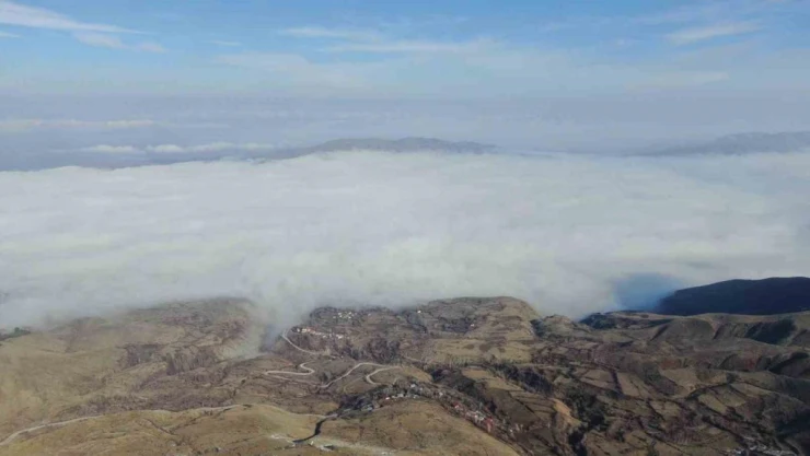 Elazığ’da sabah saatlerinde etkili olan ve yer yer görüş mesafesini 3 metreye kadar indiren sis, güneşin de yüzünü göstermesiyle birlikte Sivrice ilçesinde bulunan Hazar Gölünde eşsiz manzaralar ortaya çıkardı. İlçe merkezi sis denizinde kaybolurken, dron ile çekilen görüntüler görsel şölen oluşturdu.