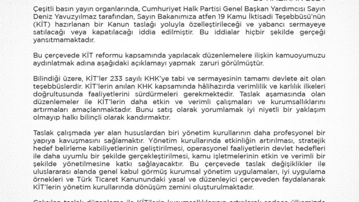 "Çeşitli basın yayın organlarında, Cumhuriyet Halk Partisi Genel Başkan Yardımcısı Deniz Yavuzyılmaz tarafından, Bakanımıza atfen 19 Kamu İktisadi Teşebbüsünün (KIT) hazırlanan bir Kanun taslağı yoluyla özelleştirileceği ve yabancı sermayeye satılacağı veya kapatılacağı iddia edilmiştir. Bu iddialar hiçbir şekilde gerçeği yansıtmamaktadır. Bu çerçevede KİT reform kapsamında yapılacak düzenlemelere ilişkin kamuoyumuzu aydınlatmak adına aşağıdaki açıklamayı yapmak zaruri görülmüştür.