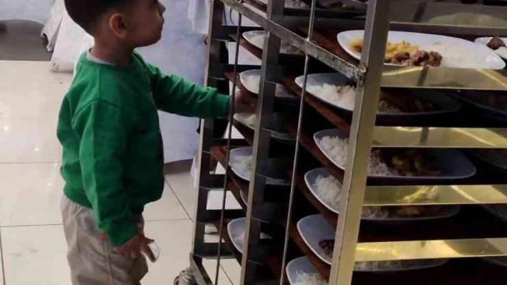 Iğdır’da hizmet veren bir düğün salonunda yemek dağıtımı sırasında yaşanalar herkesi güldürdü. Gelin damadın salona gelmesinde sonra düğün salonunda yemek servisi başladı. O sırada çok acıktığı anlaşılan bir çocuk yemek tabakların içinde olduğu servis arabasına yanaştı. Görevliler yemek dağıtırken küçük çocuk da her tabaktan et ve pilav alarak karnını doyurdu. İzleyenleri güldüren o anlar salonda çekim yapan medya firması tarafından cep telefonu ile kayıt altına aldı.