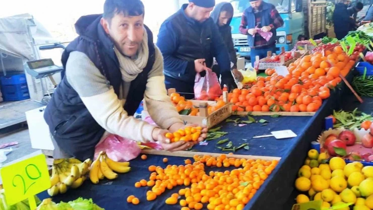 Pazarda Mersin’in Anamur ilçesinden getirdiği Kamkat meyvesini 70 TL’den satışa sunan Ahmet Koç, kabuğuyla birlikte tüketilen tek turunçgil meyvesi olan kamkatın kokusu ve tadıyla tüketiciyi cezbettiği söyledi.