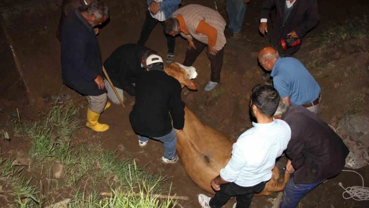 Çiftçi Yakup Pektür, "Dağdan dere yatağına yuvarlanan ineğimizi kurtarmak için özel idareyi aradık, gecenin vaktinde geldiler, bize yardımcı oldular sağ olsunlar" dedi.