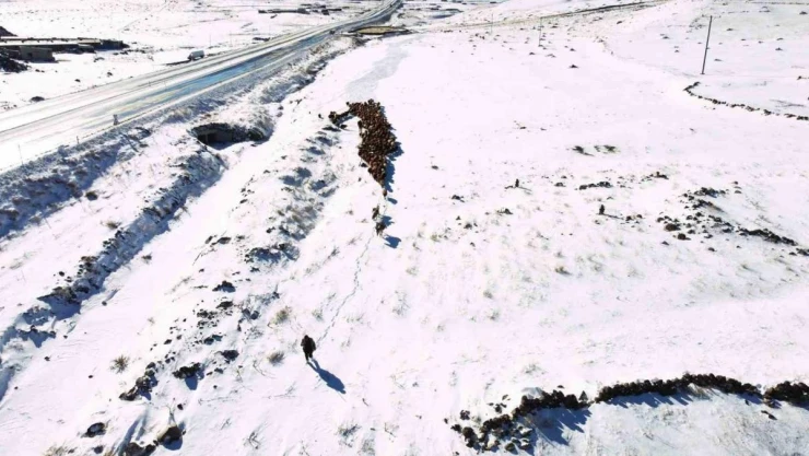 Hayvan sürülerinin zorlu kış dönüşü havadan da görüntülendi.