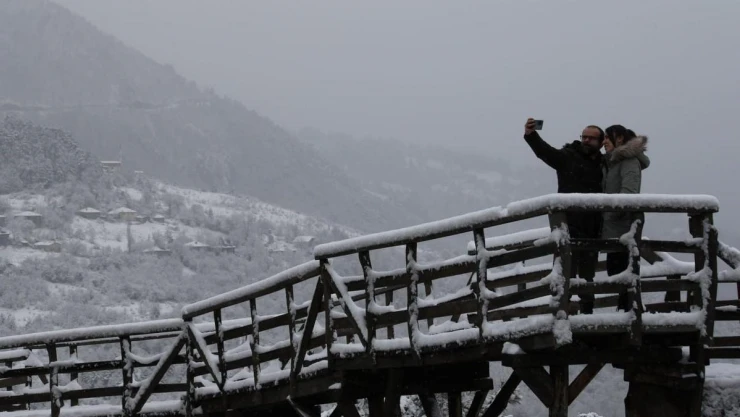 Karabük’ün Yenice ilçesinde etkili olan kar yağışı sonrası beyaz gelinliğini giyen Ihlamur Terası, kartpostallık görüntüleri ile görenleri kendine hayran bıraktı.