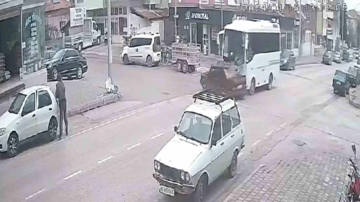 İki aracın arasında kalmaktan kıl payı kurtuldu, kaza anı kameraya yansıdı