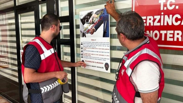 Erzincan Emniyet Müdürlüğü tarafından son dönemde Erzincan sınırları içerisinde araç alışverişinde yaşanan “dolandırıcılık” konularıyla alakalı olarak Asayiş Şube Müdürlüğü Hırsızlık Dolandırıcılık Büro Amirliğince, Erzincan’da bulunan noter ve çalışanlarıyla görüşülerek konu hakkında yüz yüze bilgi verildi. Noter binalarının dikkat çeken yerlerine dolandırıcılık konularıyla alakalı afişler asılırken kent meydanında ve noterlerde vatandaşlara bilgi maksatlı el broşürleri dağıtıldı.