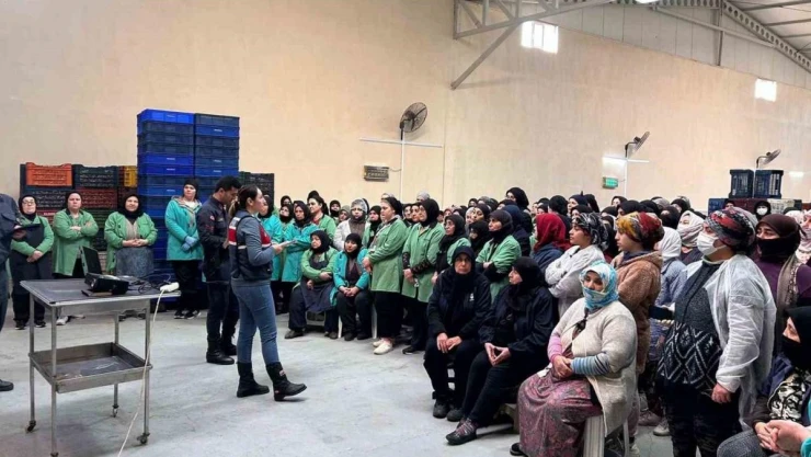 Aydın İl Jandarma Komutanlığı Aile İçi Şiddetle Mücadele Kısım Amirliği ve İncirliova Komutanlığı tarafından bir incir fabrikasında çalışan kadınlara KADES hakkında bilgilendirmelerde bulunuldu.