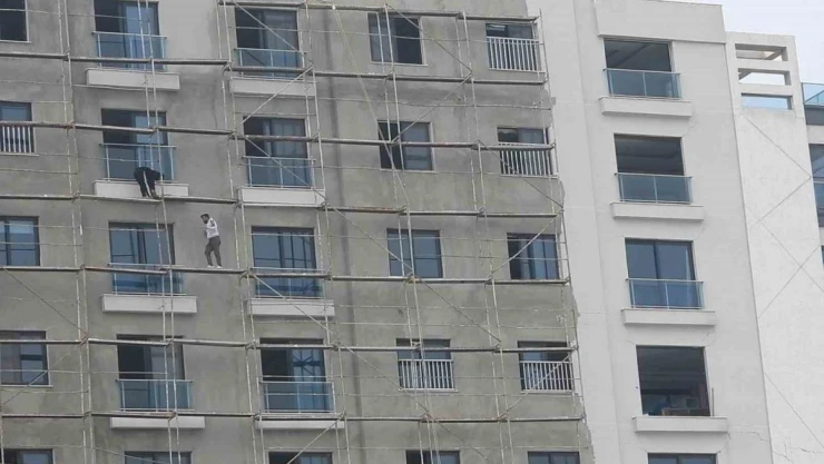 Hatay’ın Samandağ ilçesinde bir bina tadilatında çalışan ustaların şiddetli rüzgara rağmen yaklaşık 60 metre yükseklikte güvenlik önlemi almadan çalıştıkları görüldü.