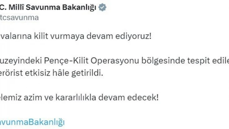 MSB, Irak’ın kuzeyinde 12 PKK’lı teröristin etkisiz hale getirildiğini duyurdu. MSB’nin sosyal medya hesabından yapılan açıklamada “Terör yuvalarına kilit vurmaya devam ediyoruz! Irak’ın kuzeyindeki Pençe-Kilit Operasyonu bölgesinde tespit edilen 12 PKK’lı terörist etkisiz hâle getirildi. Mücadelemiz azim ve kararlılıkla devam edecek” ifadelerine yer verildi.