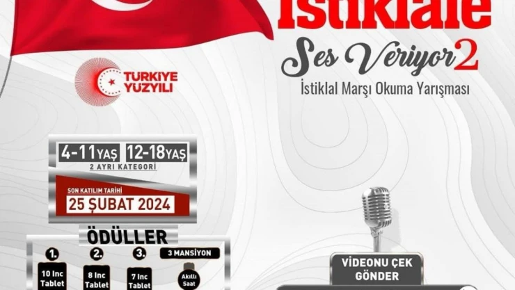 Kayseri Büyükşehir Belediyesi Kayseri Mesleki Eğitim ve Kültür A.Ş. (KAYMEK) tarafından İstiklal Marşı'nın kabulü konusunda 'İstikbal İstiklale Ses Veriyor' sloganıyla İstiklal Marşı Okuma Yarışması'nın ikincisi düzenleniyor. Başvuru için son gün 25 Şubat olan yarışmada, Türkiye Yüzyılı'nda İstikll Şairi Mehmet Akif Ersoy'un dizelerinde hissedilen milli ve manevi ruhu yansıtmak ve yaşatmak amaçlanıyor.