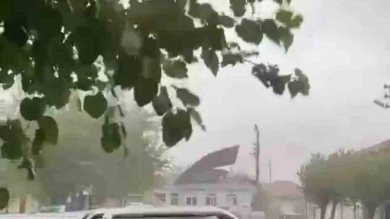 İzmir'in Bergama ilçesinde etkili olan sağanak yağış ve fırtına nedeniyle bir binadaki çatının uçma anı cep telefonu kamerasına yansıdı.