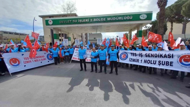 TES-İş İzmir 1 No'lu Şube'ye bağlı DSİ 2. Bölge Müdürlüğü çalışanları, düşük maaş ve vergi diliminin yüzde 10'a sabitlenmesi için eylem yaptı.