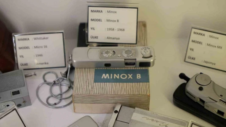 Saraç, camekanlı alan içerisinde casus makinelerin de sergilendiğini kaydederek, "James Bond’un 1969 yılındaki filminde kullandığı casus makinenin bir benzeri de müzede sergilenmektedir. Minyatür makineler bölümümüz var. Özellikle Soğuk Savaş döneminde casusların kullandığı makineler var. Aslında literatürde minyatür makine diye geçer ama halk tarafından casus makineler diye bilinir. 20’ye yakın minyatür casus makineler var. Hepsi gerçek, kişilerce kullanılmış makinelerdir" ifadelerini kullandı.