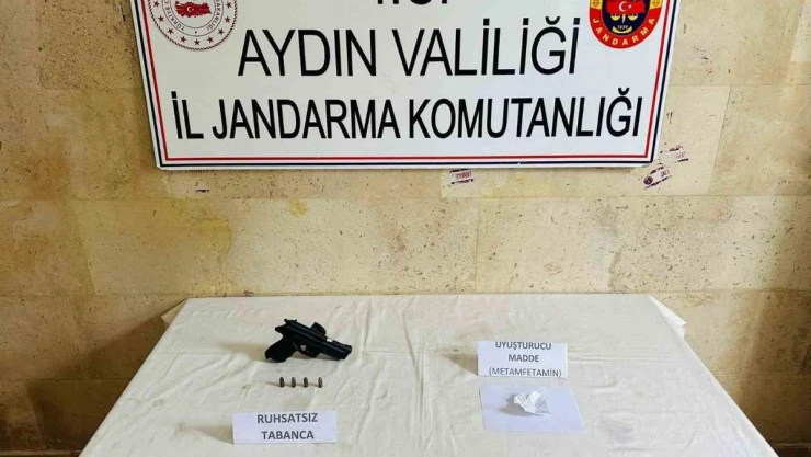 Aydın İl Jandarma Komutanlığı koordinesinde suç ve suçlulara yönelik yürütülen çalışmalar aralıksız devam ediyor. Edinilen bilgiye göre, Germencik İlçe Jandarma Komutanlığınca, Hıdırbeyli Mahallesi’nde gerçekleştirilen çalışma esnasında A.Ş. isimli şüpheli şahıs durduruldu. Şahsın üzerinde yapılan aramada 1 adet ruhsatsız tabanca, 4 adet tabanca fişeği ve bir miktar uyuşturucu madde ele geçirildi. Yakalanarak gözaltına alınan şüpheli hakkında başlatılan adli süreç devam ediyor.
