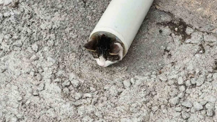 Akyurt ilçesi Saracalar Mahallesi’nde meydana gelen olayda, mahalle sakinleri Akyurt Belediyesi ve itfaiye ekiplerini arayarak sokakta bir yavru kedinin kafasının plastik boruya sıkıştığı ihbarında bulundu. İtfaiye ekipleri, boruyu keserek kediyi itfaiye merkezine getirdi. Burada belediye personeli Tuncay Sezer boruya kafası sıkışan kediyi kurtardı.