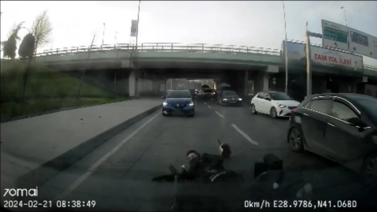 Yaşanan o feci kaza ise araç kamerasına anbean yansıdı. Kazanın ardından bir motosikletli, otomobil sürücüsüne tepki gösterirken aracını devirdi. Otomobilinden inen sürücü koşarak çarptığı motosikletinin yanına gitti. Yaralandığı öğrenilen motosikletli ambulansla hastaneye kaldırılarak tedavi altına alındı.