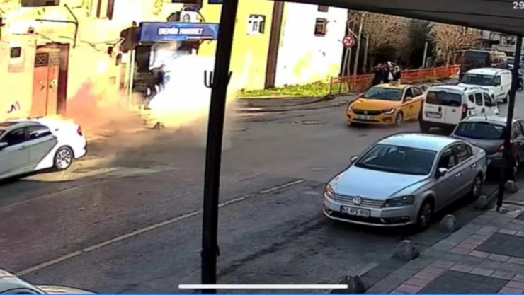 Kağıthane’de 2 kişi, tekel bayii önüne patlayıcı atıp kaçtı. Patlamanın ardından şüphelileri yakalamak için tekel bayiinden çıkan şahıs ise art arda havaya ateş açtı. O anlar güvenlik kamerasına yansıdı.