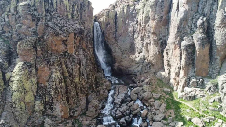 Bingöl’de karların erimesiyle ve yağan yağmurla oluşan Çır Şelalesi dron ile görüntülendi.