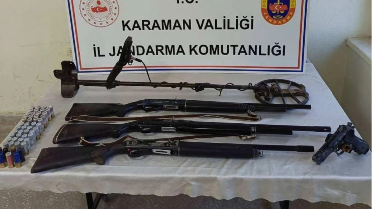 Edinilen bilgiye göre, Ermenek İlçe Jandarma Komutanlığı Jandarma Suç Araştırma Timi (JASAT) ve Kazancı Jandarma Karakol Komutanlığı ekipleri, kaçakçılıkla mücadele çalışmaları çerçevesinde H.B. isimli şahsın evinde arama yaptı. Yapılan aramada; 1’i Mersin’in Mut ilçesinde çalındığı belirlenen ruhsatlı av tüfeği ile 2 adet kaçak tüfek, 1 adet kurusıkı tabanca, 52 adet av tüfeği fişeği ile 1 adet metal arama dedektörü ele geçirildi. Gözaltına alınan H.B. hakkında adli işlem başlatıldı.