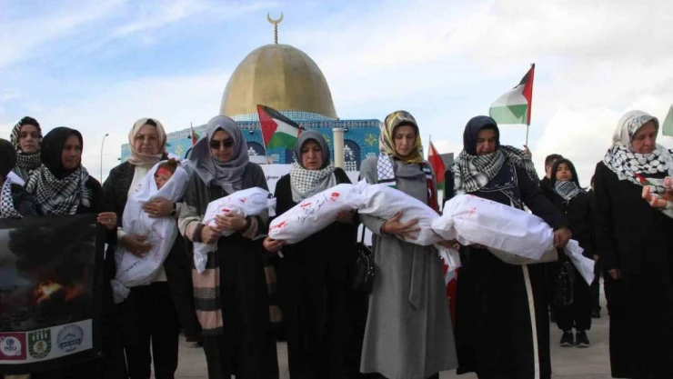 Karaman Kadın Sivil Toplum Kuruluşları Platformu üyeleri, İsrail'in Gazze'ye yönelik saldırılarında hayatını kaybeden kadın ve çocuklar için bebek kefenli eylem yaptı.