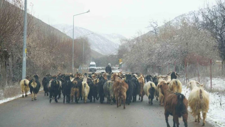 Erzincan'da araçların seyrettiği karayolunda ilerleyen keçi sürüsü ilginç görüntü oluşturdu.