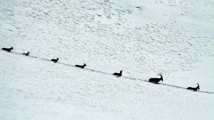Doğa Koruma Birliğinin (IUCN) yayımladığı Nesli Tükenme Tehlikesi Altında Olan Türlerin Kırmızı Listesi’nde bulunan, avlanması yasak ve koruma altındaki tür olan dağ keçileri, göç yolunda görüntülendi. Karlı arazide tek sıra halinde bata çıka ilerlemeye çalışan dağ keçileri belgeselleri aratmayan görüntüler ortaya çıkardı.