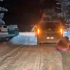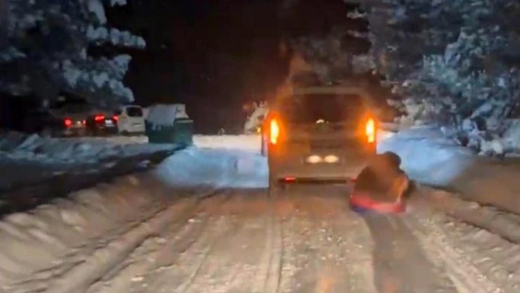 Bolu’da karlı yolda aracın arkasına şambrel bağlayarak kayan vatandaşların tehlikeli anları kameraya yansıdı.