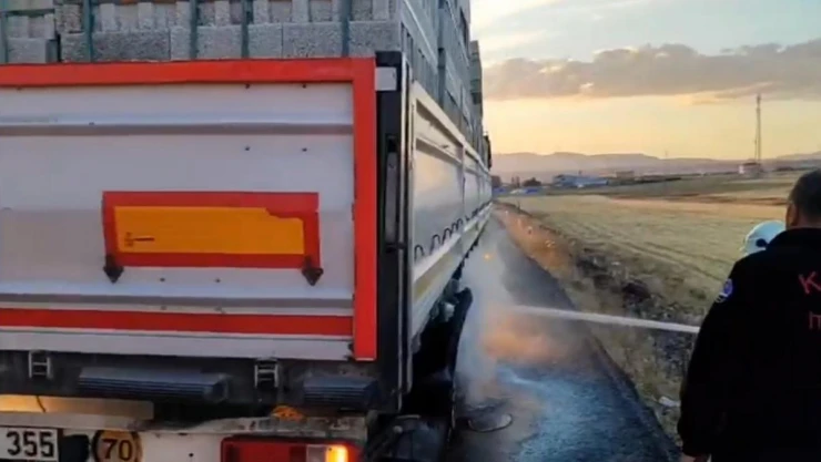 Öte yandan tırın lastiklerinin ısınan ve sıkışan balatadan dolayı alev alarak yanmaya başladığı bildirildi.