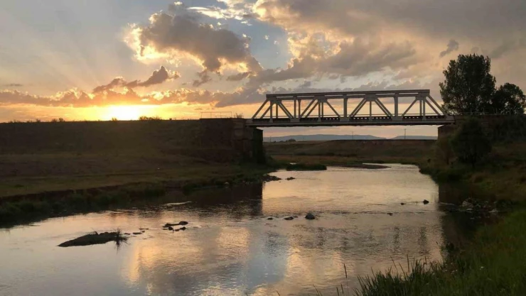 Kars merkez Benliahmet Tren İstasyonu’nun olduğu bölgede gün batımında kartpostallık görüntüler ortaya çıktı. Bakü-Tiflis-Kars (BTK) demiryolu hattının geçtiği ve Avrupa’yı Asya’ya bağlayan tarihi demir köprünün gökyüzünün kızıllığı ile suya yansıması Kars’ın güzelliklerini bir kez daha gözler önüne serdi. Kızıla bürünen gökyüzü, tarihi köprü, arpa başakları ve Selim Çayı ile muhteşem bir manzara oluşturdu.