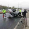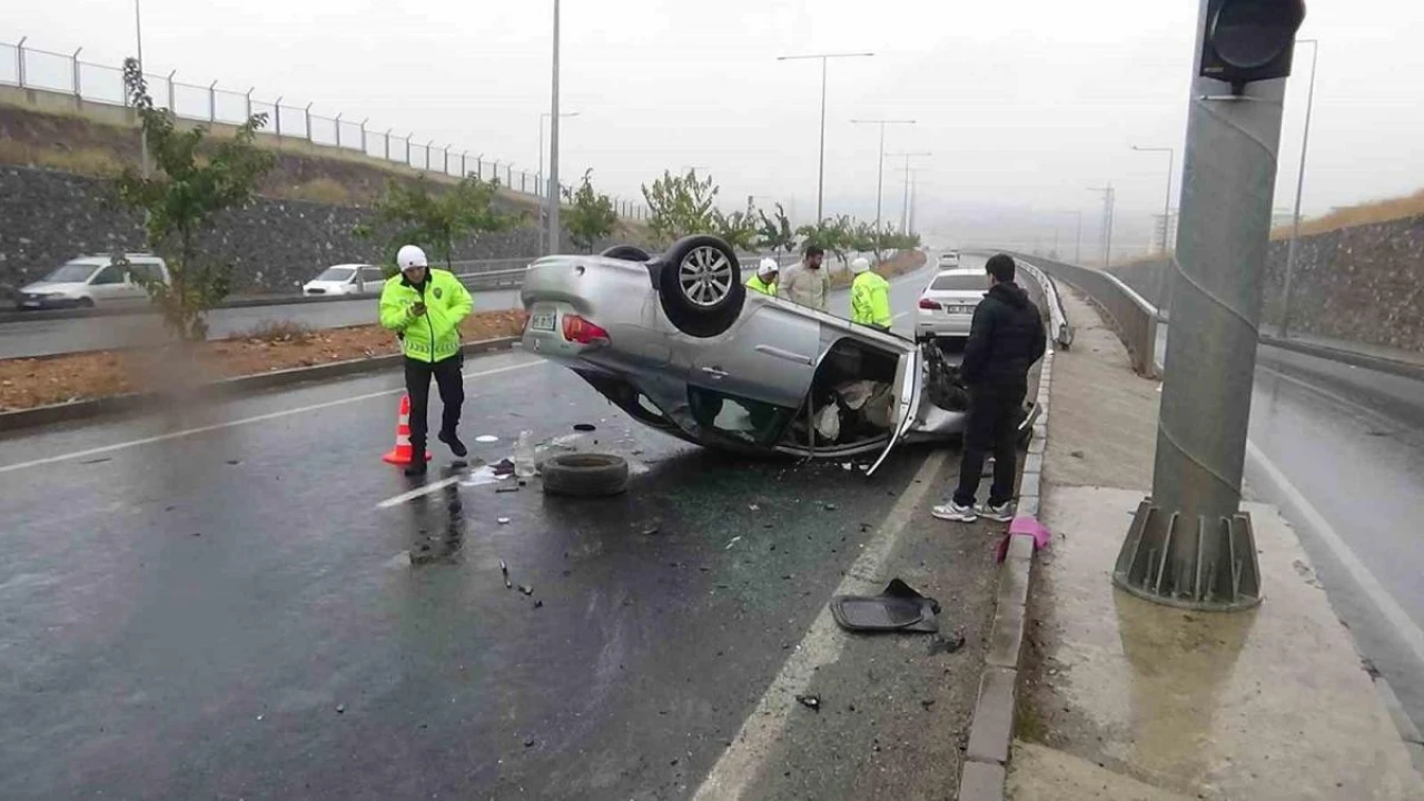 Şanlıurfa'da yağmur nedeniyle kayan otomobil trafik levhasına çarparak takla attı.