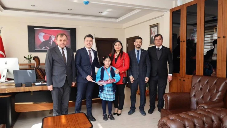 Karacasu Kaymakamı Mehmet Gündoğdu, 'Dilimizin Zenginlikleri' projesi kapsamında düzenlenen 'Dede Korkut Tarzı Hikaye Yazma' yarışmasında ilk ikincisi olan Atatürk İlkokulu öğrencisi Selen Çetinkaya'yı ağırlayarak ödüllendirdi.