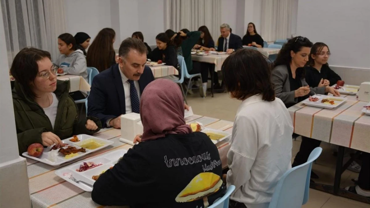 Edremit Kaymakamı Ahmet Odabaş, eşi Ayşe Odabaş ile birlikte Şehit Mustafa Serin Fen Lisesi Kız Öğrenci Pansiyonunda konaklayan öğrencilerle bir araya gelerek, akşam yemeğini birlikte yedi.