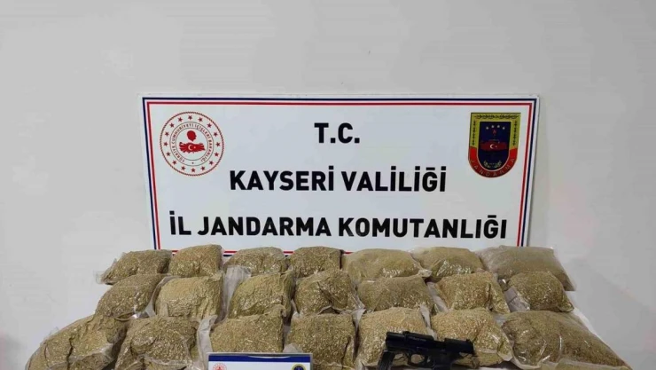 Kayseri İl Jandarma Komutanlığınca yapılan çalışmalarda yabancı uyruklu bir şahsın evinde 16 kilo uyuşturucu madde ve ruhsatsız tabanca ele geçirildi.