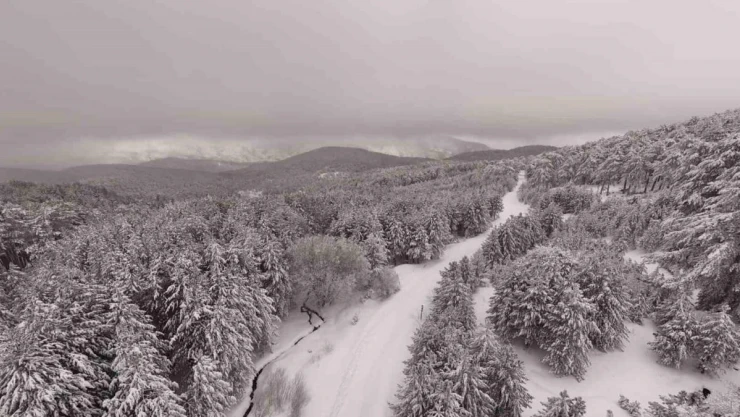 Kazdağı Milli Parkı'nda kar manzaraları dron ile görüntülendi