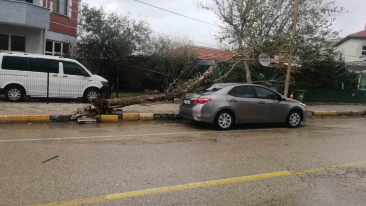 Keşan'da şiddetli rüzgar nedeniyle otomobilin üzerine ağaç devrildi