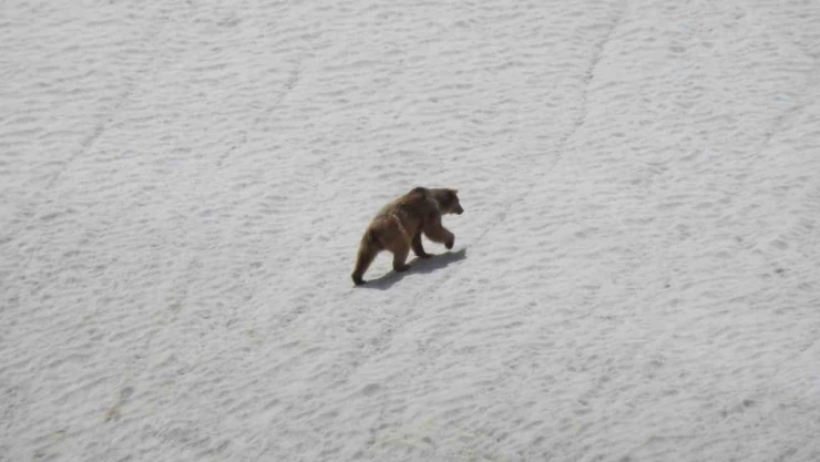 Erzincan’da kış uykusundan uyanan bir ayı, erimeye yüz tutan karlı arazide yiyecek ararken görüntülendi.