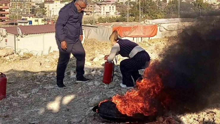 Hatay’ın Antakya ilçesinde konteyner kentte yaşayan vatandaşlara ve görevli personellere yangına karşı eğitim verildi.