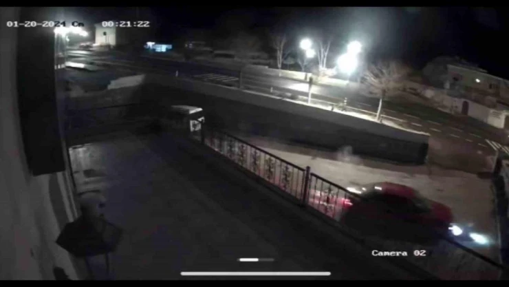 Nevşehir’de kontrolden çıkan araç bahçe duvarını aşarak, bir iş yerinin avlusuna uçtu. Otomobilin daha sonra duvara çarparak durabildiği kaza anı iş yerinin güvenlik kamerasınca görüntülendi.