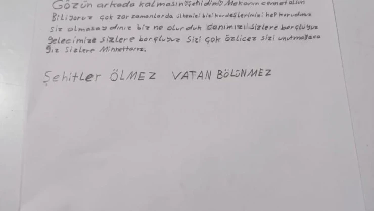 2’nci sınıf öğrencisi bir kız çocuğu ise asker olmak istediğini belirterek, Mehmetçiğe selamlarını iletti. Bir başka çocuk da, "Siz bizim için çok değerlisiniz. Bizler için gözünüzü kırpmadan hayatınızı feda ediyorsunuz. Siz bizim gururumuzsunuz" diye yazdı.