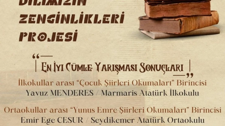 Dilimizin Zenginlikleri Projesi En İyi Cümle Yarışmasında, İlkokullar arası “Çocuk Şiirleri Okumaları” birincisi Marmaris Atatürk İlkokulu öğrencisi Yavuz Menderes, Ortaokullar arası “Yunus Emre Şiirleri Okumaları” birincisi Seydikemer Atatürk Ortaokulu öğrencisi Emir Ege Cesur, Liseler arası “Safahat Okumaları” birincisi Köyceğiz Naip Hüseyin Anadolu Lisesi öğrencisi Aygün Mamadova oldu.