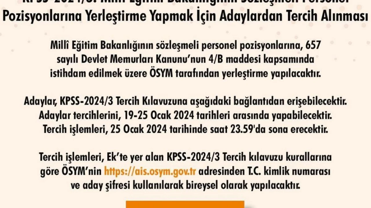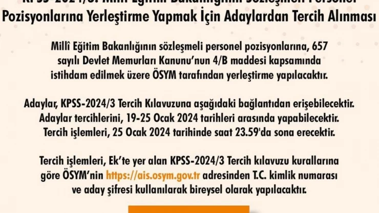 ÖSYM Başkanlığı’ndan yapılan açıklamada, Milli Eğitim Bakanlığının sözleşmeli personel pozisyonlarına 657 sayılı Devlet Memurları Kanunu’nun 4/B maddesi çerçevesinde istihdam edilmek üzere yerleştirme yapılacağını bildirdi. Adayların tercihlerini 19-25 Ocak tarihleri arasında yapabileceği belirtilen açıklamada, “Tercih işlemleri, 19 Ocak tarihinde saat 10.00’da başlayacak ve 25 Ocak tarihinde saat 23.59’da sona erecektir. Tercih işlemleri, Ek’te yer alan alan KPSS-2024/3 tercih kılavuzu kurallarına göre ÖSYM’nin ’https://ais.osym.gov.tr’ adresinden T.C. kimlik numarası ve aday şifresi kullanılarak bireysel olarak yapılacaktır. Adayların tercih işlemleri için kılavuzu dikkatle incelemeleri gerekmektedir” denildi.