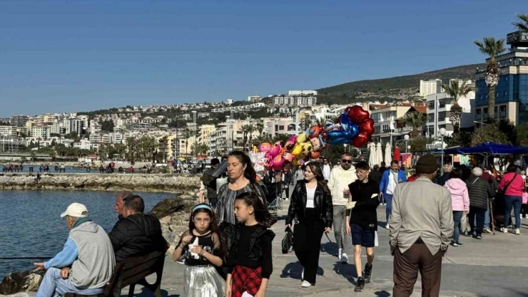Aydın'ın Kuşadası ilçesi Şubat ayının sonlarına doğru sıcak hava dalgasıyla birlikte hareketlendi. Hava sıcaklığının 21 dereceyi bulduğu kentte, güneşin keyfini çıkarmak isteyenler sahile akın etti.