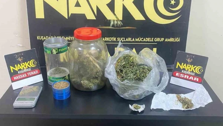 Kuşadası İlçe Emniyet Müdürlüğü Narkotik Suçlarla Mücadele Büro Amirliği ekiplerinin uyuşturucu madde kullanımı ve ticaretinin önlenmesine yönelik çalışmaları aralıksız sürüyor. Edinilen bilgiye göre, Hacıfeyzullah Mahallesi’nde bir adreste uyuşturucu madde satıldığına dair istihbarat alan polis ekipleri adresi fiziki takibe alan ekibe aldı. Bir süre sonra operasyon için düğmeye basan ekipler, evde yaptıkları aramalarda komidinin içine saklanmış vaziyette 76,9 gram esrar maddesi, 1 adet değirmen, 1 adet elek özellikli cam şişe ve 1 adet de hassas terazi ele geçirdi. Ele geçirilen malzemelere el konulurken, evde bulunan O.A. isimli şahıs yakalanarak gözaltına alındı.