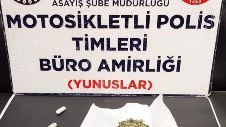 Kütahya'da Motosikletli Polis Timlerince durdurulan araçta ve 2 kişinin yapılan üst aramasında, 3,09 gram bonzai ve 3 adet sentetik ecza hap ele geçirildi.