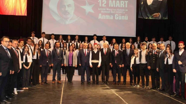 Aydın'da '12 Mart İstiklal Marşı'nın Kabulü ve Mehmet Akif Ersoy'u Anma Günü' dolayısıyla düzenlenen programda Aydın Sosyal Bilimler Lisesi öğrencileri tarafından sahnelenen gösteri ayakta alkışlandı.
