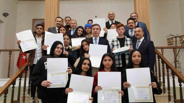 Vali Aydoğdu liseli gençleri teşekkür belgesiyle ödüllendirdi.