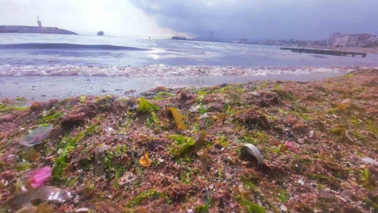Meteoroloji Genel Müdürlüğü tarafından yapılan uyarının ardından Tekirdağ kıyılarında etkili olan lodos fırtınası, şehrin kıyılarına kızıl yosun getirdi.
