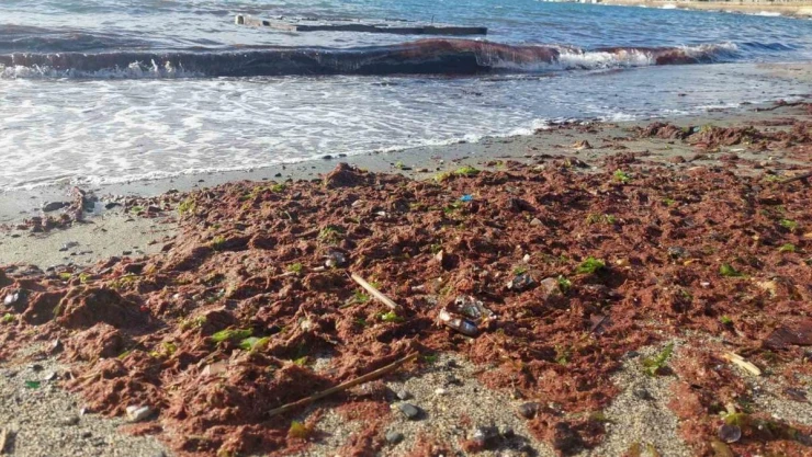 Meteoroloji Genel Müdürlüğü tarafından yapılan uyarının ardından Tekirdağ kıyılarında etkili olan lodos, kıyılara kızıl yosun getirdi.